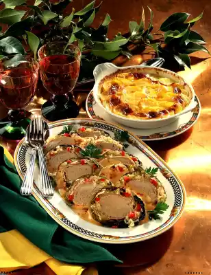Whip cream and paprika until half stiff and add to the stock. Cut the roll open, arrange on a plate with some sauce and garnish with parsley. Add the rest of the sauce extra. Potato gratin tastes good with it.