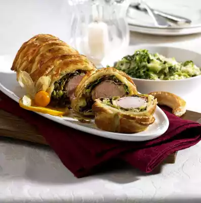 Place the fillets on top and wrap them with the help of the baking paper. Separate the egg. Coat edges of dough with egg white. Cut remaining dough into strips and cut out fleurons. Decorate the pastry coat with the strips and place on a baking tray lined with baking paper.