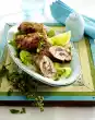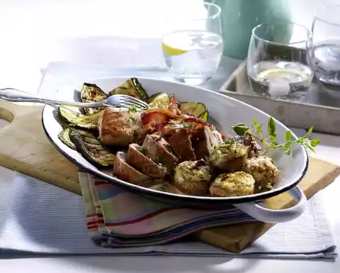 Place the stuffed mushrooms in the pan with the pork fillets. Put bacon on the fillets. Braise in the preheated oven (electric cooker: 200 °C/ convection oven: 175 °C/ gas: level 3) for 20-30 minutes. Meanwhile clean and wash the zucchini and cut them diagonally into long, thin slices.