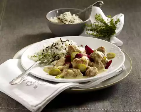 Cut cucumber into slices, beetroot first into slices, then into wide sticks. Mix sour cream and flour. Stir the mixture into the goulash, bring to the boil and simmer for 5 minutes. Mix in cucumber and beetroot, season with salt and pepper. Drain rice, let drain. Serve together with the goulash. Garnish with thyme