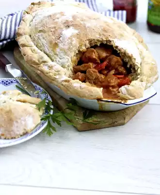 Pour the goulash into an ovenproof dish. Sprinkle some flour on a work surface, roll out bread dough a little larger than the baking dish. Place on the baking dish and press firmly over the edge of the dish. Cut the edge of the dough all around. Bake in the preheated oven (electric range: 225 °C/ convection oven: 200 °C/ gas: level 4) for approx. 20 minutes