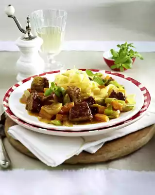 In the meantime, peel the pumpkin, quarter it and cut it into pieces. Halve the leek lengthwise, wash and cut into half rings. Add pumpkin and leek to the meat and braise for another 10 minutes.