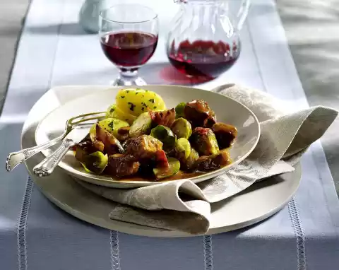 Season with salt, pepper and paprika. Add tomato paste, dust with flour and sweat it on. Deglaze with 3/4 litre water. Bring to the boil and cook covered for about 1 1/4 hours. Clean and wash the Brussels sprouts and halve them if necessary.