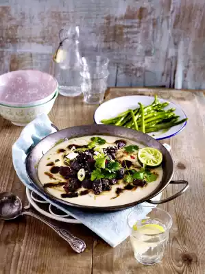 Wash the coriander, shake dry and pluck the leaves from the stalks. Wash spring onions, shake dry and cut into fine rings. Add the meat to the coconut sauce, sprinkle with coriander, spring onions and sesame seeds.