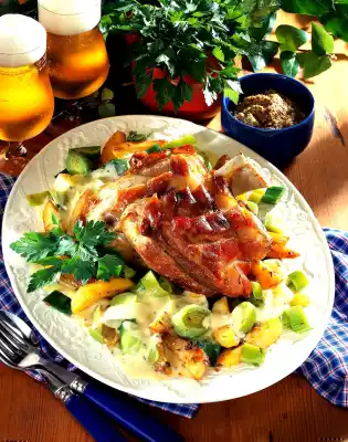 Heat fat in a pot, sweat flour in it and pour on vegetable water and milk while stirring. Bring to the boil and simmer for about 5 minutes. Stir in mustard and season with salt. Add leek to the hot sauce. Brush the rind with salted water approx. 10 minutes before the end of the frying time so that it becomes nice and crispy. Place the roast potatoes and leek-cream vegetables on a large plate and arrange the knuckle of pork on top. Serve garnished with parsley