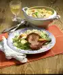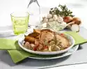 Wash the meat, dab dry and cut the rind with a sharp knife in a diamond shape. Season the knuckle of pork with salt and pepper and place it in a fat pan. Add approx. 1/4 litre of water and roast in a preheated oven (electric: 200 °C / gas: level 3) for 21/2 to 3 hours. From time to time scoop with frying stock. Wash and peel the potatoes and cut them lengthwise into wedges.