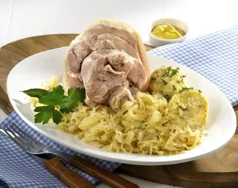 Put dumplings in a pot with cold salted water and let them swell for about 10 minutes. Bring water to the boil and let it simmer at low heat for about 10 minutes. Wash the rest of the parsley, dab dry and chop finely, except for a little bit for garnishing. Remove the dumplings, hold briefly under cold water and tear open the cooking bags. Take out the knuckles and arrange them on a plate with the sauerkraut and the dumplings. Sprinkle dumplings with parsley and garnish with bay leaf and parsley