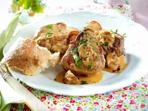 Heat 2 tablespoons of oil in a large frying pan. Fry the medallions in it in portions on each side for about 1 minute. Season with salt and pepper and remove. Add 1 tablespoon of oil to the frying fat. Fry the onions and mushrooms for about 4 minutes, turning them over.