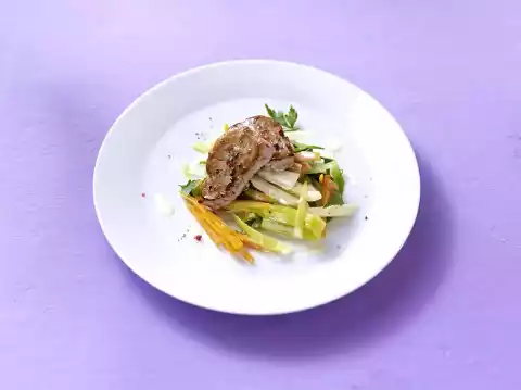 Clean or peel and wash carrots, celery and leek. Cut vegetables into strips. Wash meat, dab dry and cut into thin slices
