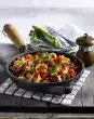 Arrange vegetables and meat on plates, possibly sprinkle meat with pepper and garnish with parsley leaves