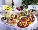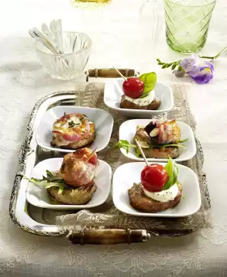 Then carefully add goat's cheese and thyme to the pan and fry briefly on both sides (be careful, it can quickly melt). Clean and wash the rocket and drain well. Wash basil and shake dry. Put a blob of crème fraîche evenly on 6 medallions, sprinkle with pepper, basil and a tomato with a wooden skewer. Put bacon mushrooms on 6 wooden skewers as well, cover 6 medallions with half of the rocket and put bacon mushrooms on top. Divide the goat's cheese between 6 medallions and put a wooden skewer on each. Spread the remaining rocket on the remaining medallions and put bacon plums on top. Serve medallions in bowls