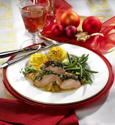 In the meantime, carefully lift the fillets out of the roaster, cover them and let them rest. Add stock, wine and 50 g cream to the stock and bring to the boil. Stir the starch and 3 tablespoons of water until smooth, add to the boiling stock, bring to the boil and simmer for about 1 minute. Season to taste with salt and pepper. Pour the beans into a sieve. Cut the meat open. Arrange duchess potatoes, sauce, meat and beans on plates. Garnish with thyme