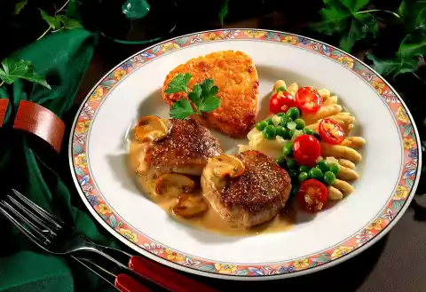 Add broth, stir in the crème-fraîche and diet binder and bring to the boil briefly. Season with salt and pepper. Add the asparagus and tomatoes to the peas and heat up with them. Season with salt. Arrange rösti, medallions, mushroom sauce and vegetables on a plate. Serve garnished with parsley