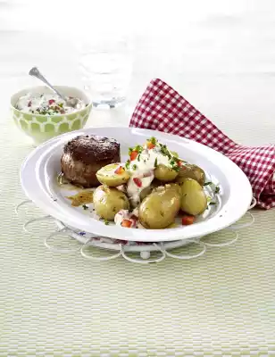 Drain the potatoes and let them steam briefly. Wash the meat and dab dry. Season with salt. Heat oil in a large, coated pan. Fry meat for approx. 5 minutes, turning. Remove, place in a greased casserole dish and cook in a preheated oven (electric range: 175 °C/ convection oven: 150 °C/ gas: level 2) for 6-8 minutes. Lightly brown the potatoes in the cooking fat for about 5 minutes. Sprinkle with salt