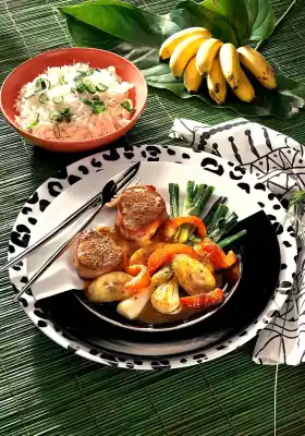 Season with salt and pepper and lift onto a preheated plate. Stew spring onion pieces and banana slices in hot frying fat for 2-3 minutes. Add tomato slices, toss briefly and sprinkle with curry. Pour in broth, bring to the boil briefly and refine with cream. Season to taste with curry and salt. Add to the meat on the plate. Sprinkle rice with spring onion rings and add extra