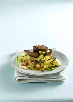 Season with vinegar, sugar, salt and pepper. Add zucchini slices and steam for about 3 minutes while turning. Fold in pine nuts. Prepare rice according to instructions on the packet. Arrange rice, zucchini salad and pork medallions on plates.