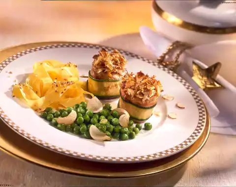 Wrap zucchini strips around the medallions and pin them with wooden skewers. Heat clarified butter in a pan and fry the medallions until golden brown, turning them over. In the meantime, mix hazelnut leaves, 15 g soft butter, egg yolk, breadcrumbs, a little salt and cinnamon.