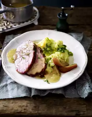 Peel 1 apple, quarter and core it. Grate finely on a kitchen grater. Remove the roast, about half of the onions and apples, cover with aluminium foil. Pass the roast through a sieve with the remaining apples and onions. Fill up with 250 ml cider and add grated apples. Bring everything to the boil. Stir starch with a little water until smooth. Thicken the sauce with it and let it simmer for about 1 minute. Season to taste with salt and pepper. Cut the roast open and serve with sauce, onions, apples and puree. Drizzle melted fat over the puree. Garnish with set aside thyme