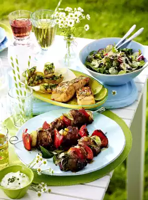 Clean, wash and cut the peppers into pieces. Peel onion and cut into thick slices. Wash the bay leaf, shake dry. Pluck off leaves, except for something to garnish. Remove the meat from the marinade, alternate with the bell pepper, onion and bay leaf on 8-10 skewers. Season skewers with salt. Cook on the hot grill, turning several times, for about 10 minutes. Brush with the beer marinade from time to time. Mix the prepared salad ingredients with the rocket vinaigrette. Season to taste once again. Season the skewers with pepper and serve them garnished with rosemary and laurel. Serve with the salad. Serve with bread and a quark dip