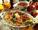 Season with salt, pepper and dried marjoram. Braise open in a preheated oven (electric cooker: 200 °C/ convection oven: 175 °C/ gas: level 3) for approx. 1 1/2 hours. Dissolve stock in approx. 1/2 litre of hot water. After a braising time of approx. 30 minutes, gradually pour on the stock. Cover after 1 hour if necessary. Garnish with marjoram