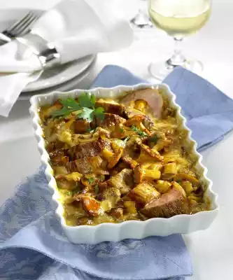 Put the meat and mushroom cream in an ovenproof dish and sprinkle with cheese. Bake in a preheated oven (electric cooker: 200 °C/ convection oven: 175 °C/ gas: level 3) for 30-35 minutes. In the meantime prepare rice in salted water according to the instructions on the packet.