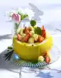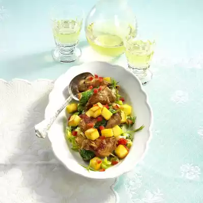 Add another 1 tablespoon of oil to the frying fat. Add the potatoes and fry for about 5 minutes. Add pointed cabbage, fry for another 5 minutes. Season with salt and pepper. Deglaze with 1/8 litre water, fold in tomatoes, boil down for 2 minutes. Serve garnished with rosemary