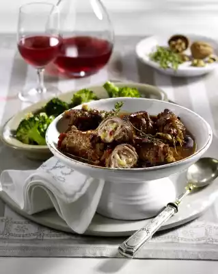 Roll it up and pin it down. Heat the oil in a frying pan or casserole. Fry the rolls in it thoroughly all around. Season with salt and pepper. Add garlic and fry briefly. Add Marsala and 250 ml water, season with salt and pepper.