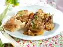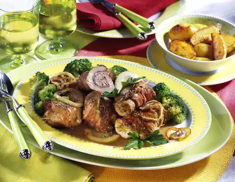 Season with salt and pepper. Bring the sauce to the boil and refine with cream. Season with lemon juice, salt and pepper. Stir in the sauce thickener, bring to the boil briefly. Arrange roulades in the sauce with onion rings, broccoli and potatoes.