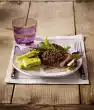 Wash the meat, pat dry, tap a little flatter. Brush with mustard and season with salt and pepper. Halve the bacon and place it on the meat and spread the relish on top. Roll up the roulades firmly and pin them with small wooden skewers or a roulade needle.