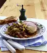 Heat 2 tablespoons of oil in a frying pan. Fry the onion rings for about 5 minutes and remove. Add 1 tablespoon of oil to the pan and fry the roulades in it all around for about 10 minutes. Deglaze the roulades with 300 ml water and add stock.