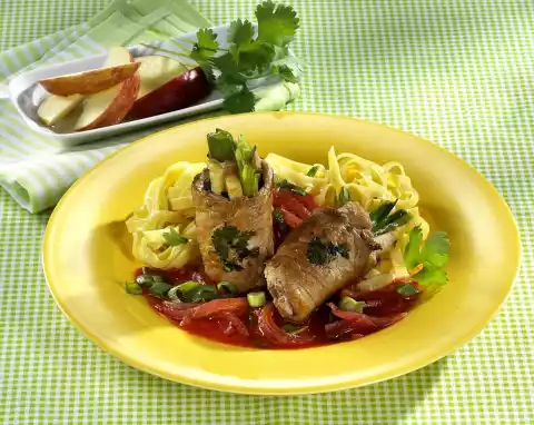 Deglaze with tomato juice and stock, bring to the boil. Mix the starch in a little cold water and thicken the sauce with it. Season to taste with salt, pepper and curry. Drain the pasta. Arrange roulades with noodles and sauce on plates.