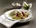 Place a piece of leek and apple pegs on top of each. Roll up the meat and pin it with wooden skewers. Place 1 coriander leaf on each roulade. Heat 2 tablespoons of oil in a pan. Brown the roulades all around.