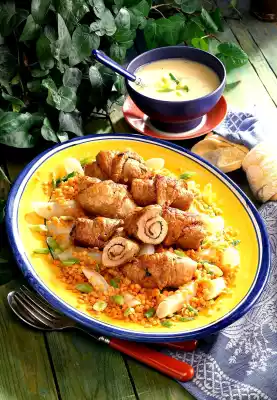 Wash the meat and dab dry. Mix the sambal oelek and tomato paste, season to taste with salt, pepper and sugar. Clean and wash the spring onions and put half of the leek leaves aside. Cut the remaining spring onions into small rings. Brush the meat with the Sambal-Oelek mixture and cover with the leek onion leaves. Roll up the roulades and stick them together with one wooden stick each. Heat the oil in a pan, add the roulades and fry on both sides for about 2 minutes. Deglaze with 1/2 litre vegetable stock and let it braise for about 20 minutes. In the meantime, wash, clean, peel and wash black salsify again, cut into pieces and immediately place in 1 litre vinegar water. Cook the black salsify and lentils in 2 litres of boiling vegetable stock for about 15 minutes. Add the remaining spring onions 3 minutes before the end of the cooking time. Pour the vegetables onto a sieve and collect the broth. Mix cornflour and sour cream. Bring 1/2 litre of vegetable stock to the boil, remove from the heat, stir in sour cream and cook for 1 minute in the reheat. Remove the roulades from the pan and pull out the wooden sticks. Arrange vegetables and roulades on a plate and add the sauce