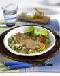 Heat the fat in a saucepan and brown the mushrooms and remaining onions lightly. Season with salt and pepper. Add rice and deglaze with remaining white wine and 1/4 liter broth. Bring to the boil, cover and simmer at low heat. Heat remaining stock and add to rice after about 10 minutes and let it swell for another 10-15 minutes. Mix Parmesan cheese with the finished rice. Lift the roulades out of the stew and keep warm. Pour cream into the stewed stock, bring to the boil and sprinkle in sauce thickener while stirring. Bring to the boil again briefly, season with salt and pepper. Heat the rest of the spinach and simmer for about 3 minutes. Arrange roulades with some sauce and spinach on a plate. Rub the rest of the ricotta on top and sprinkle with red pepper. Garnish with parsley. Add mushroom risotto and remaining sauce extra