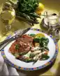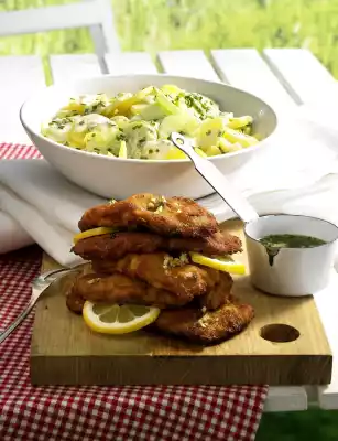 Turn escalopes first in flour, then in egg and finally in breadcrumbs. Heat clarified butter in a pan and fry the escalopes for about 6 minutes, keeping them warm. Mix sour cream and sour cream and add to the potatoes with the cucumber. Mix everything carefully, season with salt, pepper and sugar. Wash the chives, dab dry, cut into small rolls and add to the potato salad. Froth butter. Briefly toss the garlic and parsley in the butter, then pour over the escalopes and serve with the potato and cucumber salad. Garnish with lemon slices