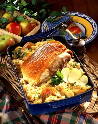 Wash the meat, dab dry and season with salt and pepper. Cut the rind with a sharp knife. Place the roast in a roasting pan and bake in a preheated oven (electric range: 175°C/ gas: level 2) for two hours. In the meantime peel onion and cut into slices. After half of the frying time, add the onion slices, bay leaf, juniper berries and sauerkraut to the roaster, deglaze with apple juice and season with salt, pepper and sugar. Wash apples, quarter them, remove seeds and cut into slices.