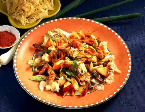 Peel and wash the carrots and cut them into sticks. Clean, wash and chop spring onions and cabbage. Wash, quarter and core the apple thoroughly. Cut apple quarters into slices. Dab meat dry and cut into strips. Fry in hot fat while turning for about 5 minutes. Season with salt and pepper.