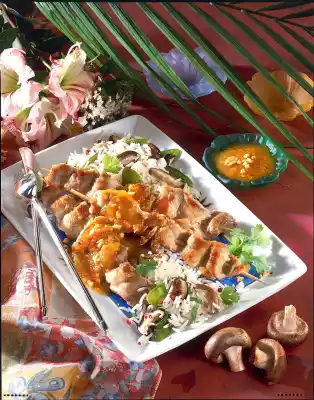 Add sugar snap peas and cook at low heat for about 5 minutes. Season with salt and pepper. Dab meat dry, first cut into thin slices, then into strips. Put them on 8 shish kebabs in a wave shape. Fry skewers in the remaining oil for about 5 minutes. Season with salt and pepper. Puree apricots and juice with the cutting stick of the hand mixer. Remove skewers from the pan, stir apricot puree into the frying oil and bring to the boil once. Season with salt and sambal oelek. Chop the peanuts and add to the sauce. Chop the coriander. Stir the mushrooms, sugar snap peas and coriander into the rice.