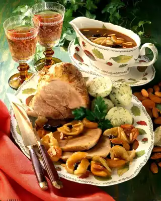 Soak the baked fruit in approx. 3/8 litres of warm water approx. 2 hours before starting cooking. Dab meat dry, pour stock through a sieve, collect. Drain vegetables and spices well. Heat clarified butter in a roaster and fry the meat all around.