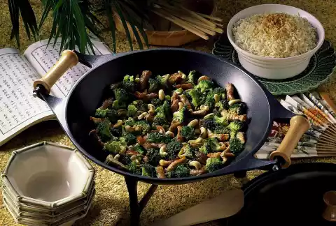 Cut pork steak into strips. Cut broccoli into fine florets. Heat oil in a wok and fry the meat in it until golden brown. Slide to the edge and add the broccoli.