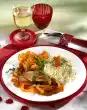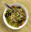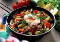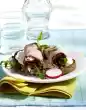 Season with salt and pepper. Arrange vegetables and meat on a plate. Spread sunflower seeds over the meat. Garnish with radishes. Add sauce.