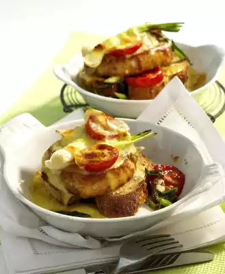 Place 2 baguette slices in each of 4 small fireproof moulds. Place 1 steak, 1 tomato, 1 spring onion and 1 camembert (or put everything in a large casserole dish). Dust with sweet paprika