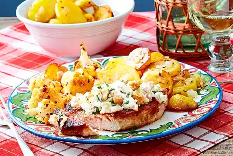 Remove cabbage from the tray, cover and put aside. Place the chops on the baking tray, spread the fat mass on top. Gratinate under the hot oven grill for about 5 minutes. Arrange everything.