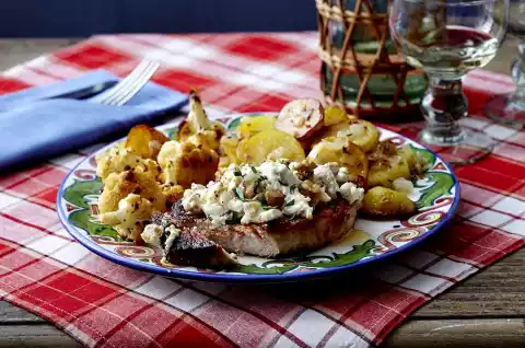 Roughly chop the nuts. Crumble feta. Mix both with crème fraîche. Season with pepper. Wash the meat, dab dry. Cut potatoes into slices. Peel and chop onion.