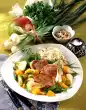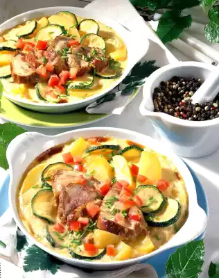 Bind with sauce thickener and season with salt and pepper. Fill potatoes and zucchini into two small greased gratin dishes (approx. 16 cm Ø). Cut the meat into slices and place them on the vegetables.