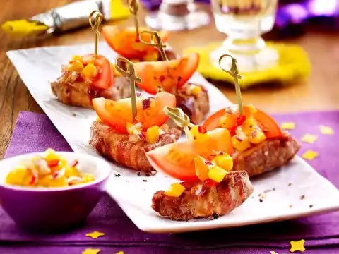 Take it out. Wash and clean the tomatoes and cut them into 16 slices. Fix them on the pork medallions with wooden skewers, add some salsa and serve. Add the rest of the salsa.