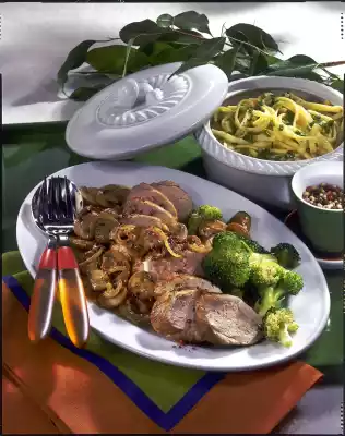 Rinse dried mushrooms and soak in 150 ml warm water for about 1 hour. Clean mushrooms, wash if necessary and cut into slices. Peel, halve and slice the onions. Wash meat if necessary, dab dry. Heat the oil in a pan and fry the fillet for 12-15 minutes, turning. Remove, wrap in aluminium foil and keep warm.