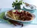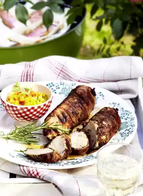 Wash the rosemary, shake dry and pluck the needles from the twigs. Season pork tenderloin with salt, pepper and paprika, wrap in bacon with rosemary and grill for 20-30 minutes while turning. Wash oregano and shake dry