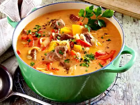In the meantime, pour the peaches into a sieve and collect the juice. Cut the peaches into pieces. Pour chilli sauce, peaches with juice and cream into the pot. Heat again, season with salt and pepper. Wash the parsley, shake dry and chop up, except for something to garnish. Delicious with baguette