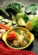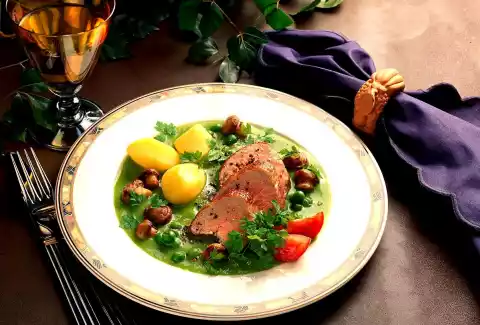 Wash the chervil and dab dry. Drain the potatoes. Cut pork fillet into slices. Arrange meat, mushrooms and potatoes on the pea sauce. Sprinkle chervil leaves on top. Garnish with tomato wedges
